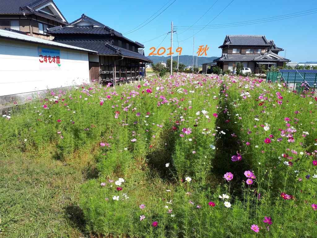 ニュース 2019/10/21 こすもす畑 今年の春、こすもす園横の畑にこすもすの種を蒔いていただき、10月には満開のこすもす畑になりました。 こすもすは加東市の花でもあります。 にじぐみさんは自分より背の高いこすもす畑の中を散策し、お土産にこすもすを摘んで持って帰りました。 こすもすは台風にも負けず、まだまだ綺麗に咲いています。近くに来られた方は是非ご自由にお持ち帰りください。
